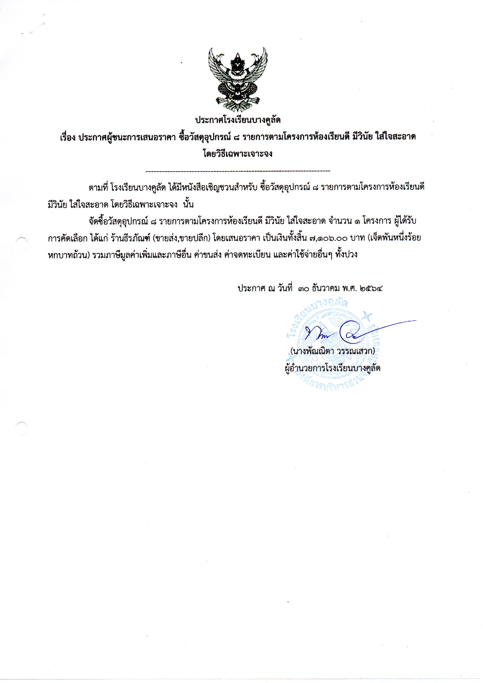 | ประกาศโรงเรียนบางคูลัด เรื่องประกาศผู้ชนะการเสนอราคา จัดซื้อวัสดุตามโครงการห้องเรียนดี มีวินัย ใส่ใจสะอาด โดยวิธีเฉพาะเจาะจง ประกาศ ณ วันที่ 30 ธันวาคม พ.ศ. 2564 |